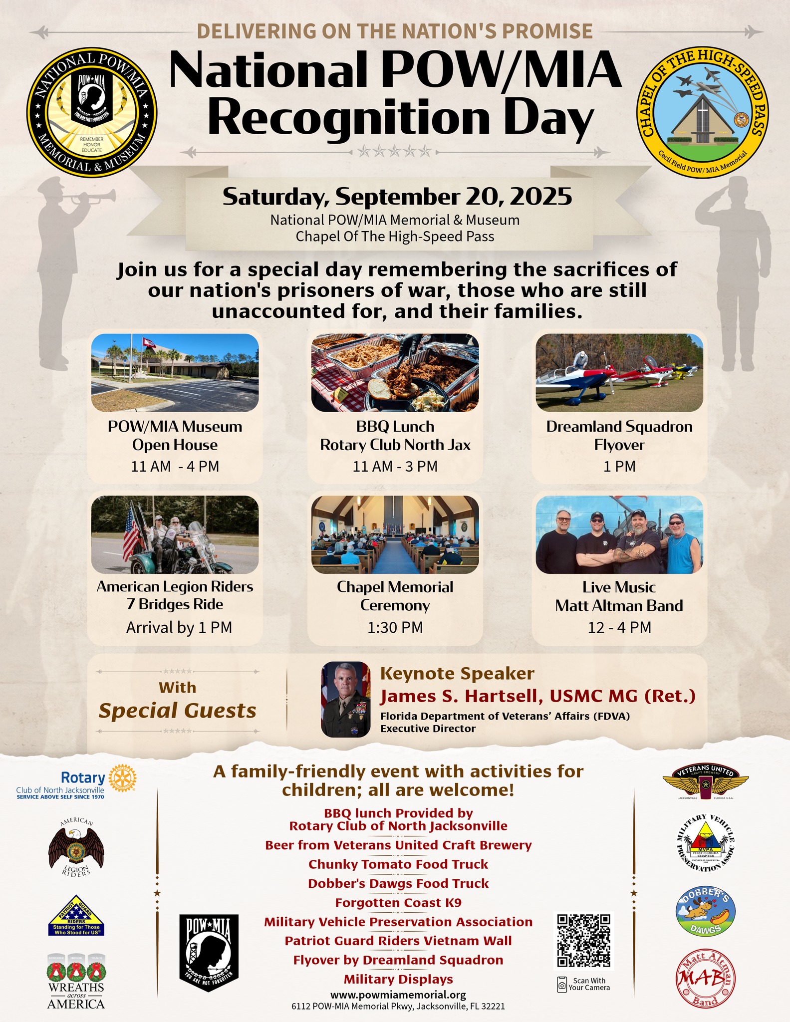 The National POW/MIA Memorial and Museum hosted an extraordinary day of remembrance this past Saturday, honoring the brave sacrifices made by our nation’s prisoners of war, those who remain unaccounted for, and their families. The event featured a delightful array of food, engaging activities, informative tours of the museum, and a poignant Recognition Day service held in the Chapel, with keynote speaker James S. Hartsell, USMC MG (Ret.).