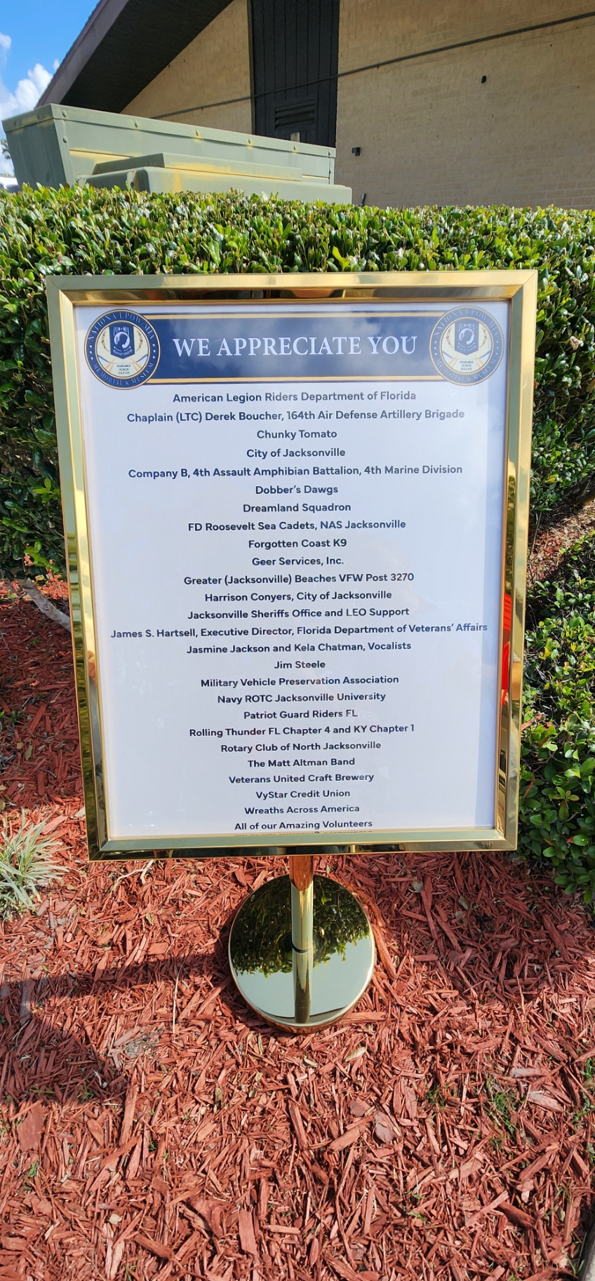 A heartfelt thank you to the Rotary Club of North Jacksonville for their delicious BAR-B-Q lunch, as well as to Chunky Tomato and Dobber's Dogs food trucks for providing tasty offerings. Veterans United Craft Brewery also added to the day’s enjoyment with their refreshing beverages as music filled the air throughout the event, courtesy of the Matt Altman Band.